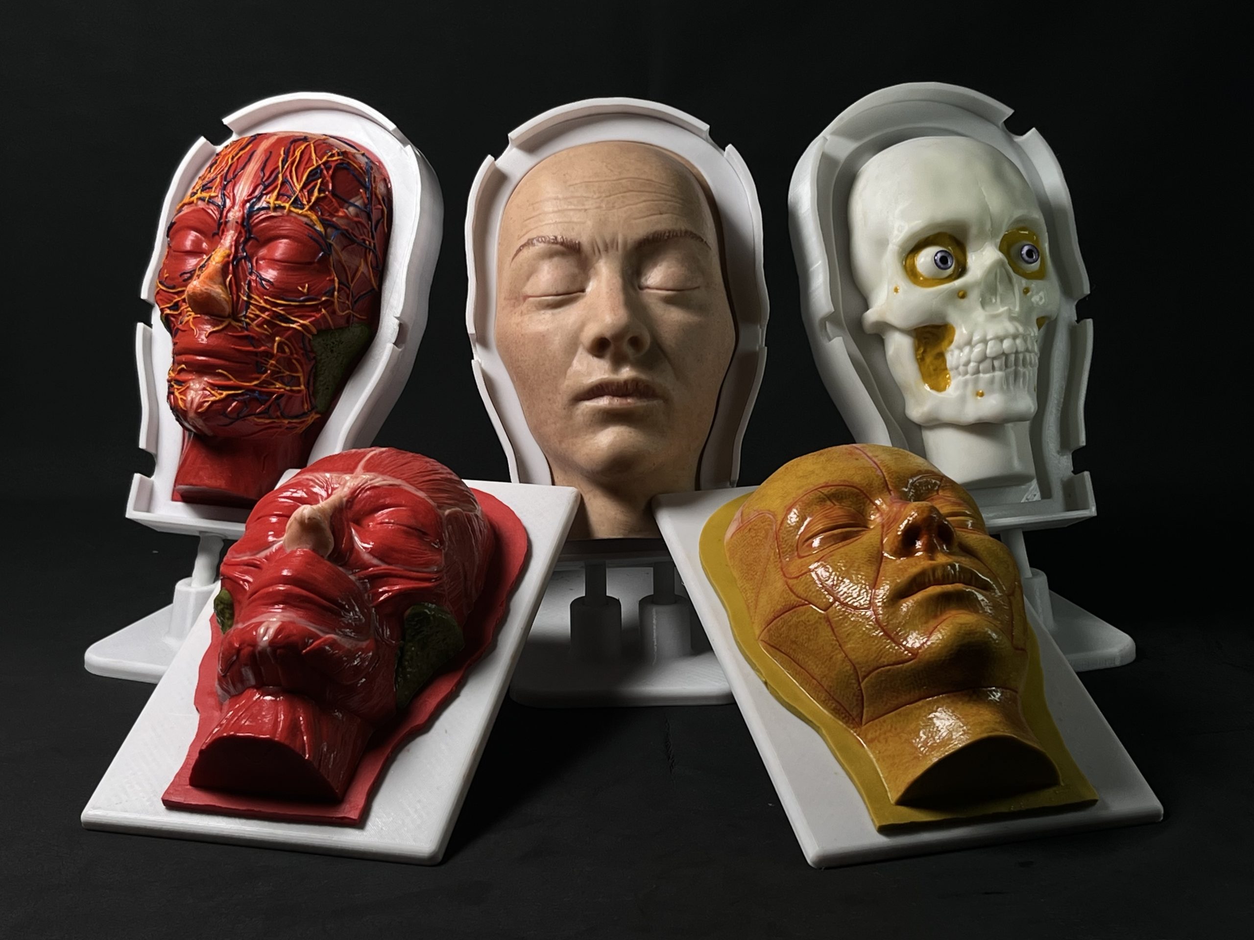 In the case of the CerebraFace, our most comprehensive full-face anatomical model, it allows you to visualize all the layers of the face, from the skin to the bone. Therefore, we can visualize the skin, the superficial fat tissue layer, veins and arteries, muscles, intramuscular fat tissues, deep fat tissues, ligaments, and bones.